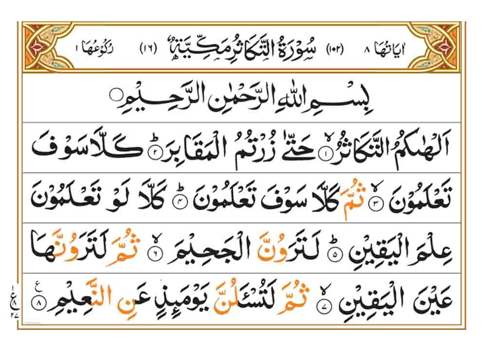 | Surah Name | At-Takasur (The Piling Up / Competition) |